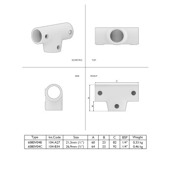Die auf den Fotos abgebildeten Verbindungsstücke sind mit Abmessungen beschrieben. Jedes Verbindungsstück hat einen einfachen und eindeutigen Referenzcode, der Typ genannt wird, um es von allen anderen Verbindungsstücken zu unterscheiden. Der vollständige Code besteht aus dem Verbindungsstuckstyp und der Größe, welche die Größe des passenden Rohrs oder der Rohre angibt, die verbunden werden können.