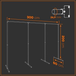 Modell Hannover: Das Walk-In-Triple-Rack mit der Höhe von 200 cm ist in 5 Breiten - 235, 300, 375, 450 und 495 cm erhältlich. Die 2 vertikalen Mittelstangen stabilisieren die gesamte Konstruktion und verhindern das Durchbiegen der Kleiderstange