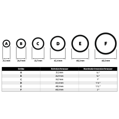 Alle Rohrverbinder sind mit einer Größe gekennzeichnet, die dem jeweiligen Rohrdurchmesser entspricht. Bei Verbindern der Größe D - 42 mm beispielsweise beträgt der Durchmesser des für diesen Verbinder vorgesehenen Rohrs 42 mm. Es ist zu beachten, dass jede Muffe ein gewisses Spiel hat, da das Rohr im Inneren der Muffe mit einer Dockingschraube befestigt ist. Daher wird auch ein minimal kleineres oder größeres Rohr passen.