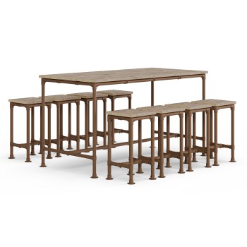 Discover a bar table that combines industrial character with functionality for catering. Solid metal structure and natural spruce planks with the right moisture content make the furniture durable, stable and ready for heavy use in restaurants, bars, bistros or beer gardens.