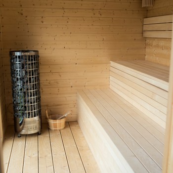 Our outdoor sauna was created from certified C24 Scandinavian spruce, so it is robust, warm and ready for any weather. With full rock wool and double-glazed insulation, it heats up quickly, whether you choose an electric furnace or a wood-fired furnace sauna. Inside, comfortable aspen benches and atmospheric LED lighting await, providing a great ambience for evening relaxation.