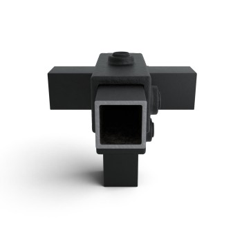 Conexión en T de salida lateral - 25 mm. Abrazadera de tres direcciones utilizada para fijar montantes con tres tubos horizontales que son perpendiculares entre sí. El tubo vertical pasa a través de la abrazadera.