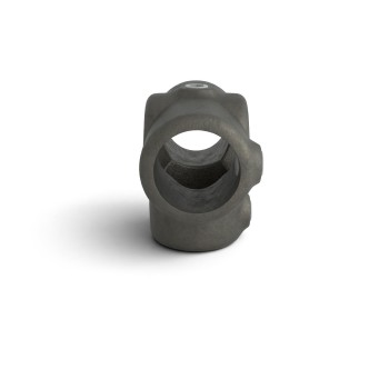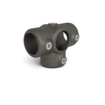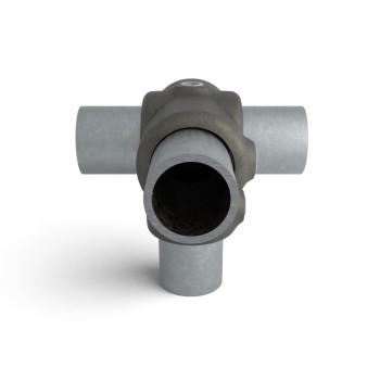 Op voorraad - verzending binnen 2–9 werkdagenT-stuk met zij-uitgang. 3-weg klem om verticale stijlen te koppelen aan 3 horizontale buizen die haaks op elkaar staan. De verticale buis loopt door de klem.
