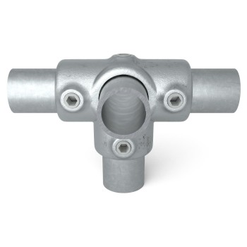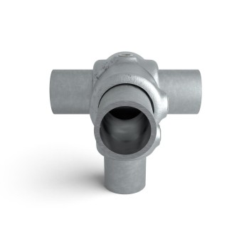 Trójnik rurowy z rurką wsporczą typ 24, 3-kierunkowy łącznik do mocowania kolumn z 3 poziomymi rurami ułożonymi prostopadle względem siebie. Rura kolumny mieści się w złączu. To złącze jest przewidziane do połączenia z rurą wsporczą. Z ciągłej rury nośnej z trzech innych rur można podłączyć pod kątem prostym. Trzy rury łączące odbiegają od rury wsporczej w trzech różnych kierunkach.
